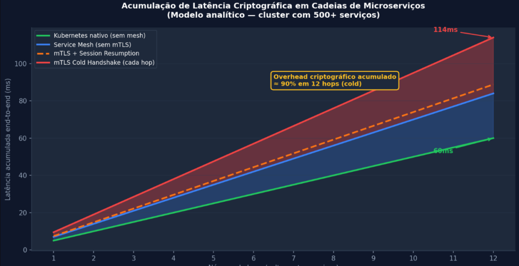 Gráfico 2: Modelo analítico de acumulação de latência em cadeia de microserviços. A diferença entre mTLS com cold handshake e Kubernetes nativo em 12 hops representa ~90% de overhead criptográfico acumulado.