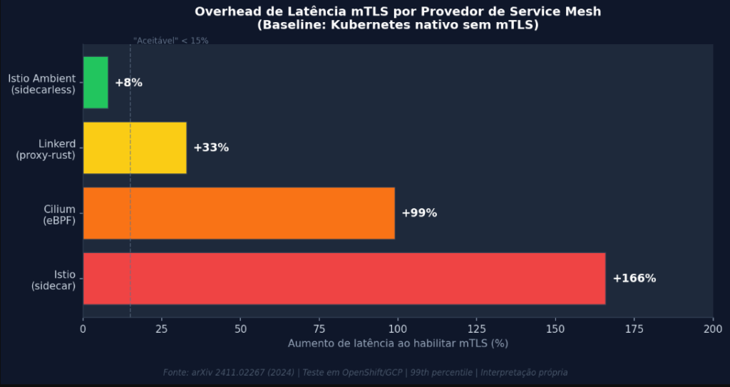 O benchmark publicado pela Deepness Lab (2024) e corroborado pelo paper arXiv 2411.02267 mostra que o Istio em modo sidecar, ao habilitar mTLS, apresenta aumento de latência de 166% no percentil 99 comparado ao Kubernetes nativo sem mTLS. O Linkerd fica em 33%, o Cilium (eBPF) em 99%, e o Istio Ambient em apenas 8%. Esses números, porém, são medidos em topologias simples e com cargas moderadas. Eles representam o piso do problema, não o teto.