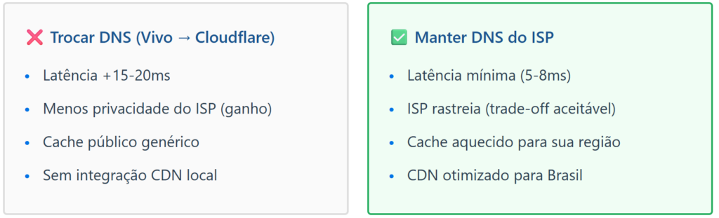 Para usuário urbano Vivo/Oi/Tim: Mantenha DNS do ISP (ganho de 15-20ms). Se privacidade é crítica, use VPN combinada com DNS ISP.