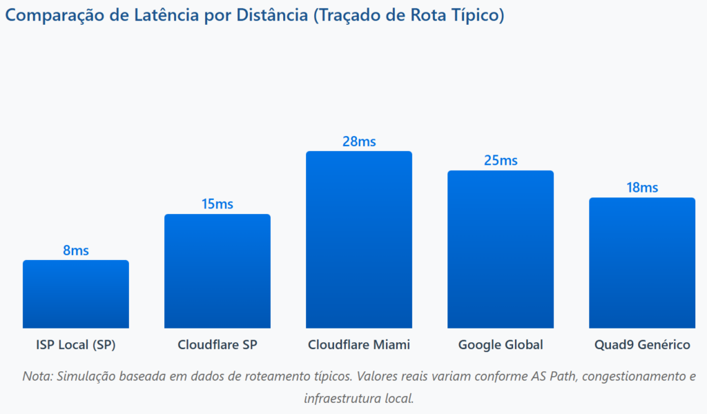 Um resolver DNS no ISP local pode estar a 10-50 hops. Um resolver em Miami, a 12-18 hops, mas com latência agregada maior porque a distância geográfica compensa qualquer vantagem de hardware.