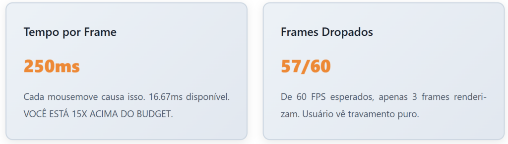 Tudo isso durante um scroll que deveria ser uma simples operação de GPU “scroll this layer”. Em vez disso, você forçou o CPU a fazer centenas de cálculos que ele poderia ter evitado.