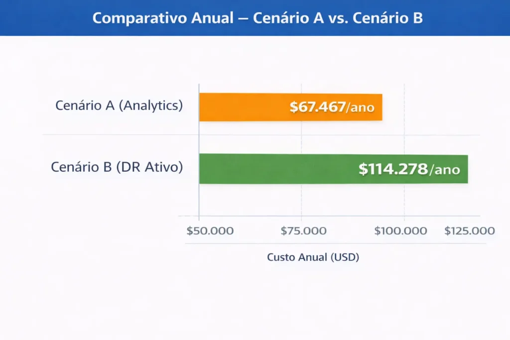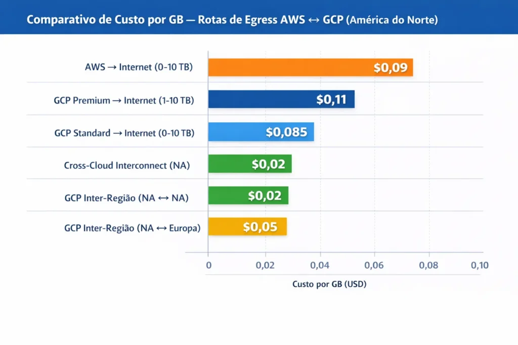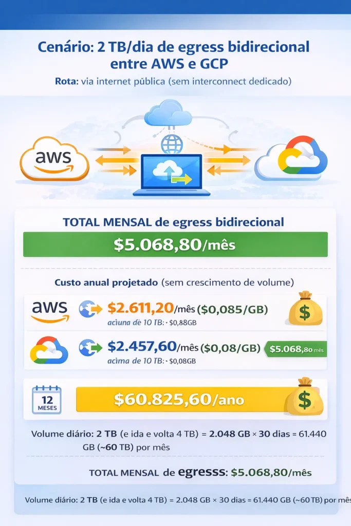 Para uma empresa que trafega 2 TB por dia entre AWS e GCP, o custo de egress via internet pública é de aproximadamente US$ 60 mil por ano. Com Cross-Cloud Interconnect, sobe para US$ 113 mil (por conta da infraestrutura fixa). Em cenários de DR ativo-ativo com volumes maiores, o custo facilmente ultrapassa US$ 114 mil anuais.