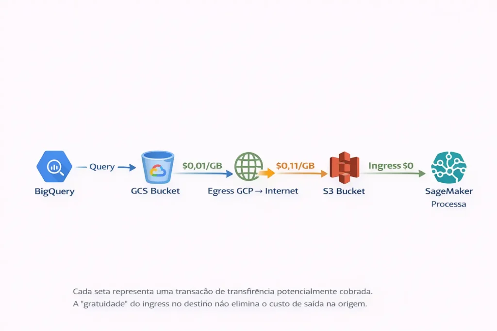 Quando você exporta dados do BigQuery para Cloud Storage (para posterior transferência à AWS), o egress inter-região dentro do GCP já custa US$ 0,01 por GB se origem e destino estão na mesma região, e sobe para US$ 0,02-0,08 entre regiões. Esse custo se soma ao egress do Cloud Storage para a internet. Em pipelines que processam centenas de queries por dia, cada export gera uma camada adicional de cobrança que não aparece no cálculo primário.