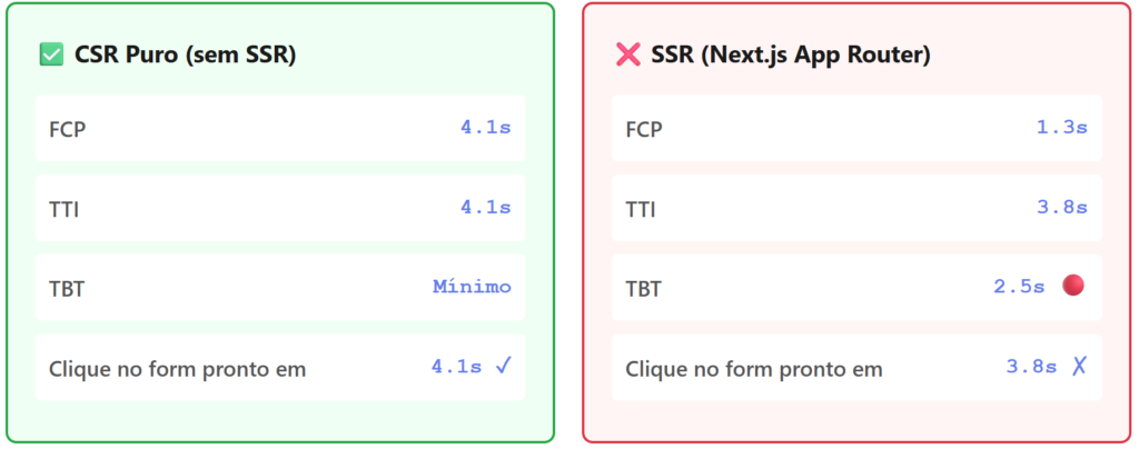 Verdade Incômoda: O SSR reduz o FCP (First Contentful Paint) em até 60%, criando uma ilusão de velocidade. Mas durante o TBT (Total Blocking Time) da hidratação — período em que o JavaScript “acorda” o HTML — sua aplicação fica completamente inerte. Usuários reais experimentam isso como uma página que fingiu estar pronta.